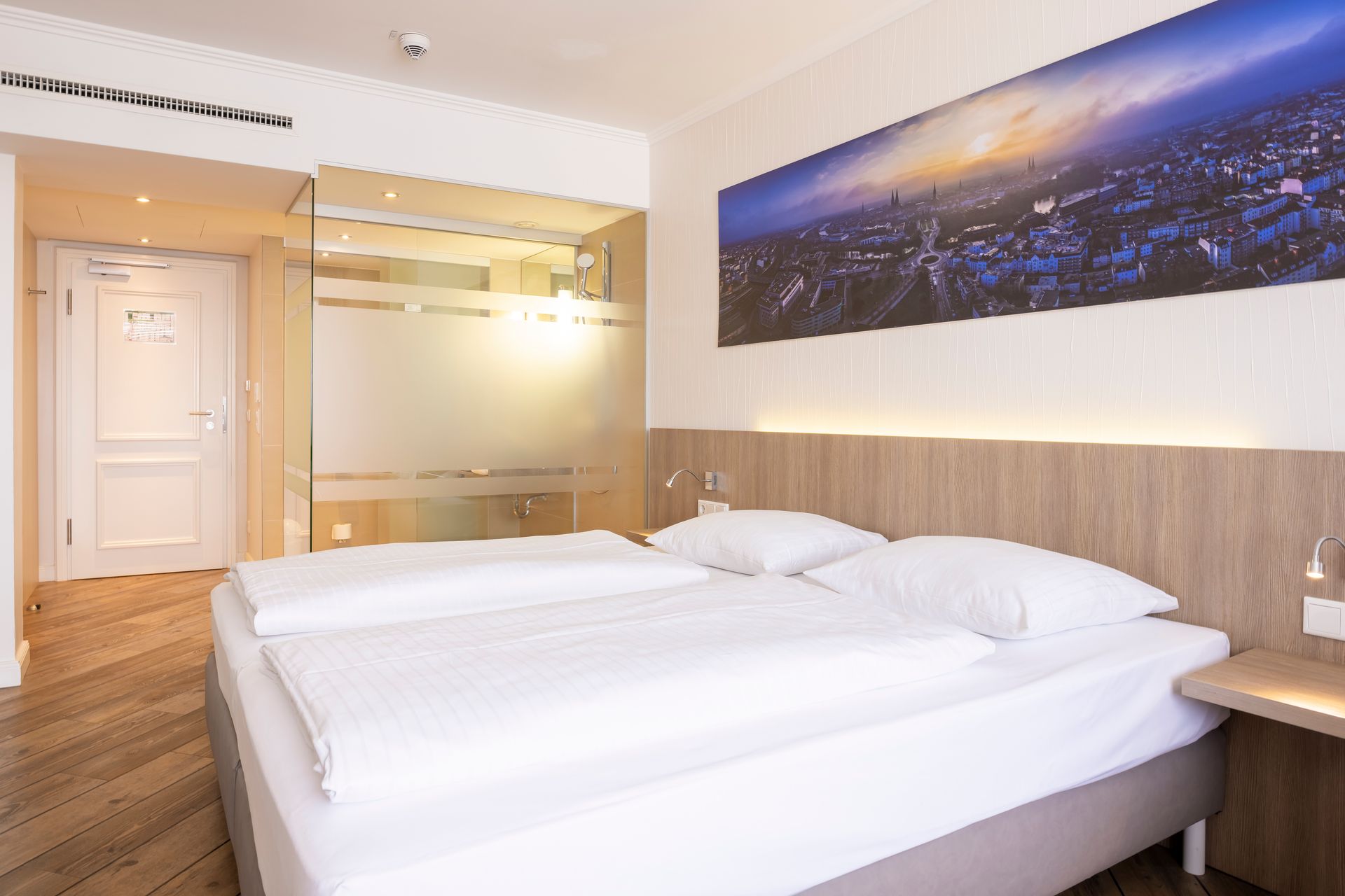 Auf ca. 20–25 m² erwartet Sie ein komfortables Zimmer mit Doppelbett (2 Matratzen à 90 x 200 cm), separatem Schreibtisch und großzügigen Ablageflächen. Ein geräumiger Doppelschrank bietet ausreichend Platz für Ihr Reisegepäck. Das moderne Bad verfügt über eine ebenerdige Dusche sowie Kosmetikspiegel und Fön. Zur weiteren Ausstattung gehören Flatscreen-TV, Zimmersafe mit Steckdose und eine Klimaanlage, die tagsüber und nachts für angenehme Temperaturen sorgt.